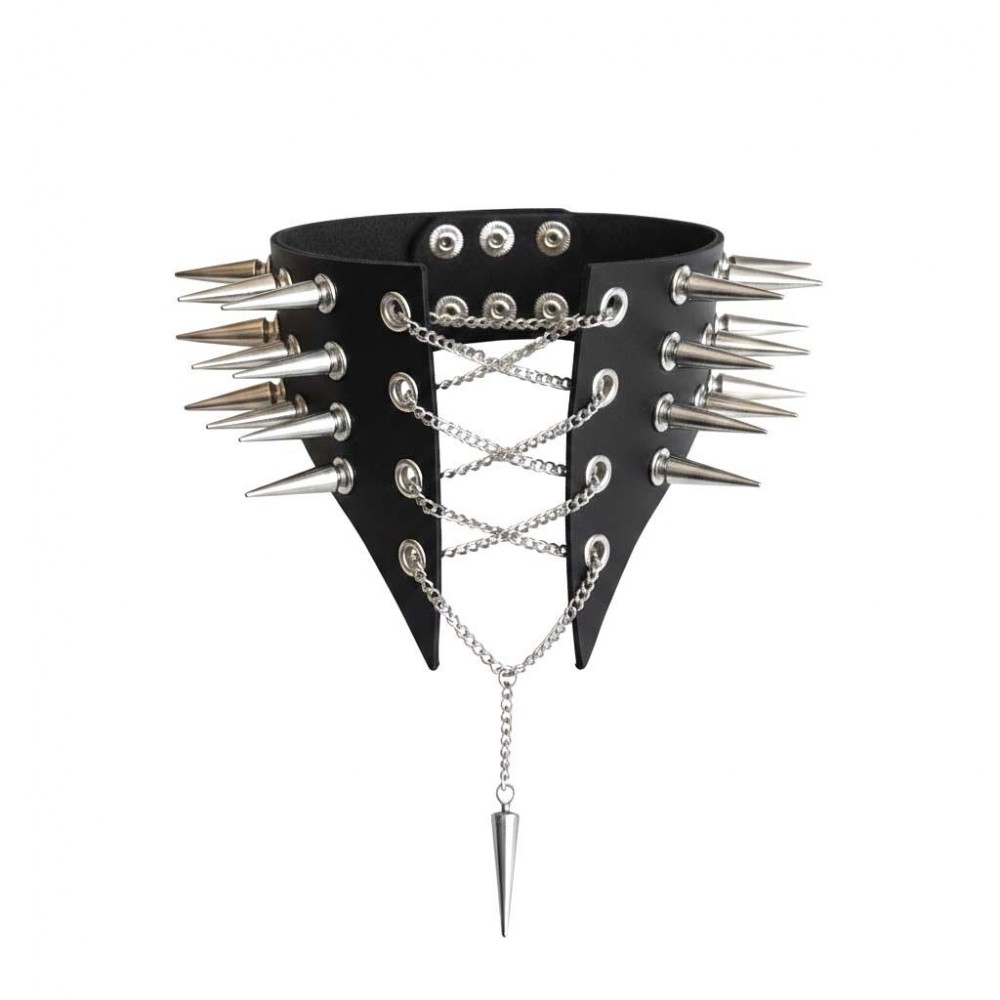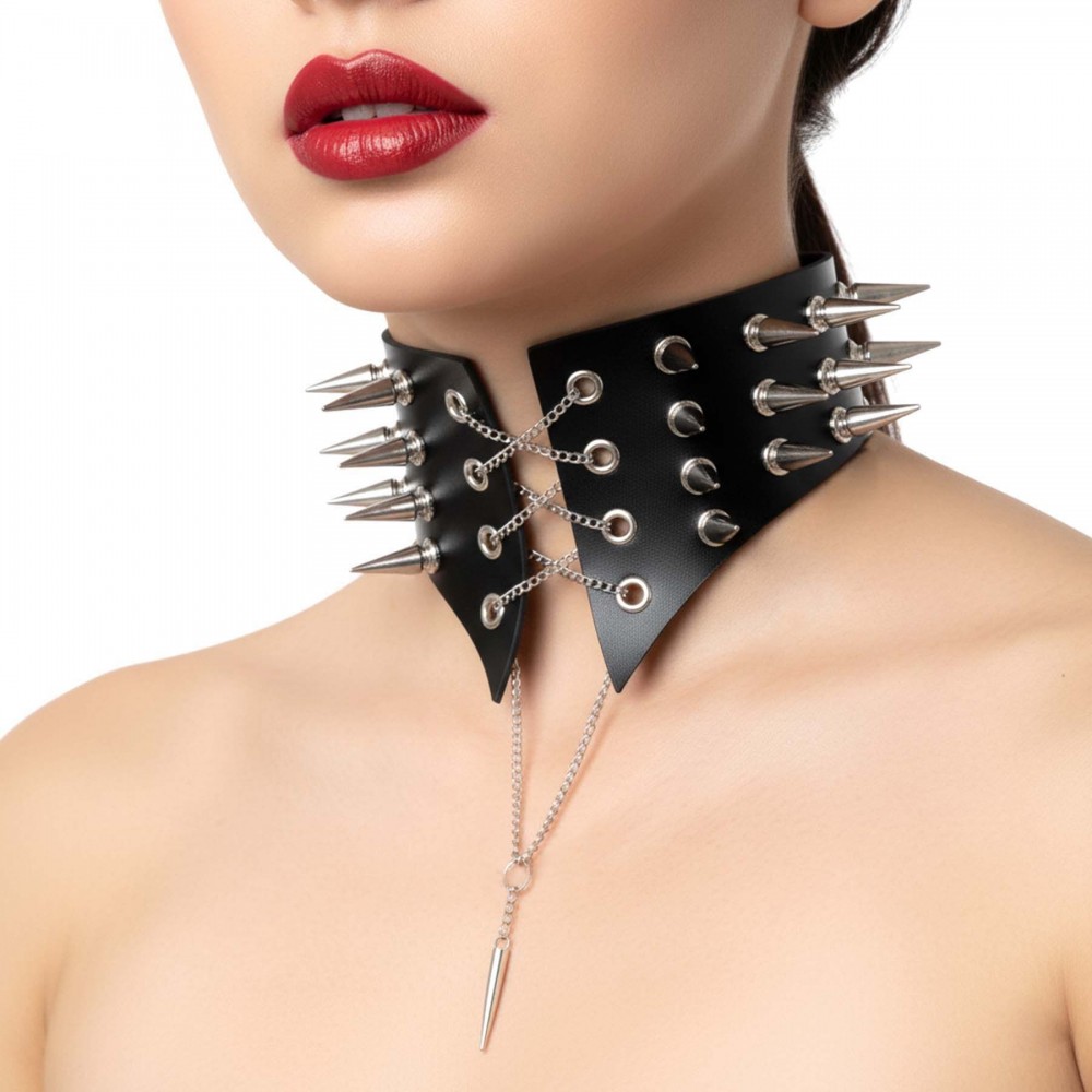 Боковые шипы добавляют агрессии и характера — это деталь, которая работает с любого ракурса. Спереди — провокационная шнуровка на цепях. Переплетение металла создает напряжение, усиливает драму и притягивает взгляд к центру композиции. Подвеска добавляет динамики — при движении она ловит свет и усиливает эффект.