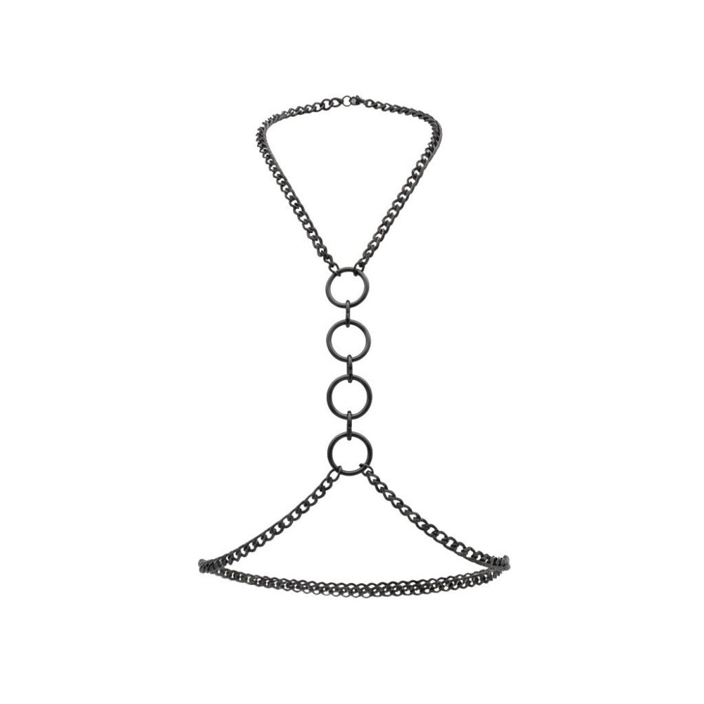 Конструкция мягко ложится по контуру, обрамляя зону декольте и подчеркивая талию. Центральные кольца усиливают драматичность образа и добавляют нотку доминирования. В движении цепи красиво перекликаются с телом, создавая игру света и притягательную динамику.