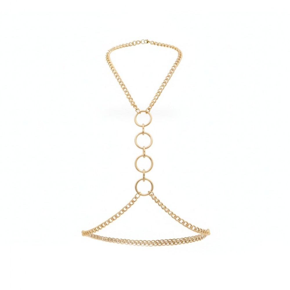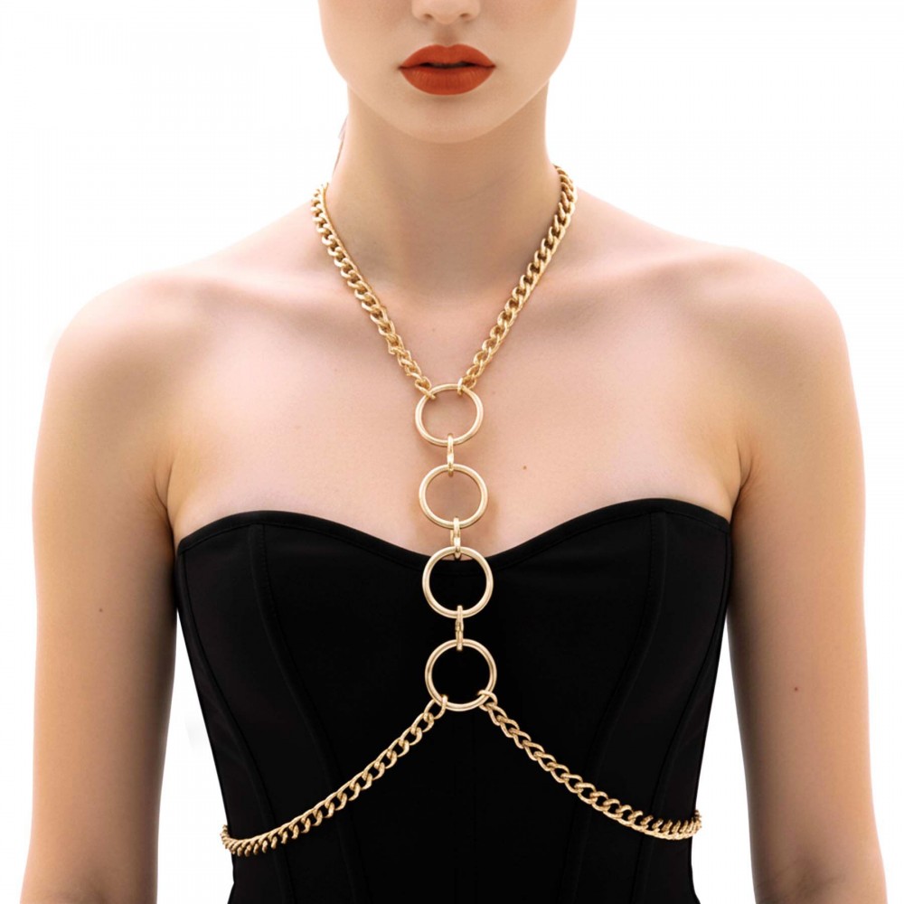Конструкция мягко ложится по контуру, обрамляя зону декольте и подчеркивая талию. Центральные кольца усиливают драматичность образа и добавляют нотку доминирования. В движении цепи красиво перекликаются с телом, создавая игру света и притягательную динамику.