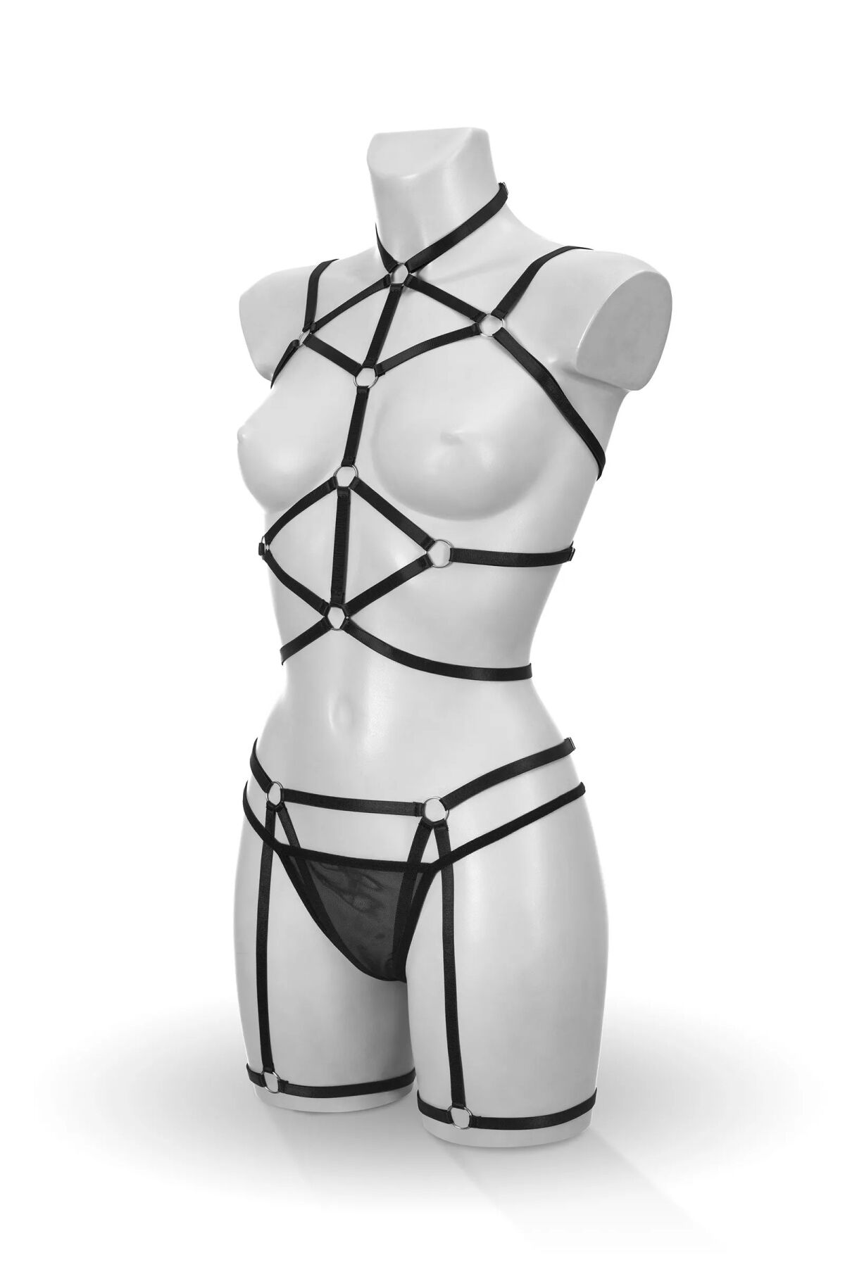 Эта металлическая портупея — не просто украшение, а откровенный акцент, который приковывает взгляд к линии шеи, груди и талии. Жёсткие звенья и выразительные кольца создают эффектную вертикаль, визуально вытягивая силуэт и подчеркивая изгибы тела.