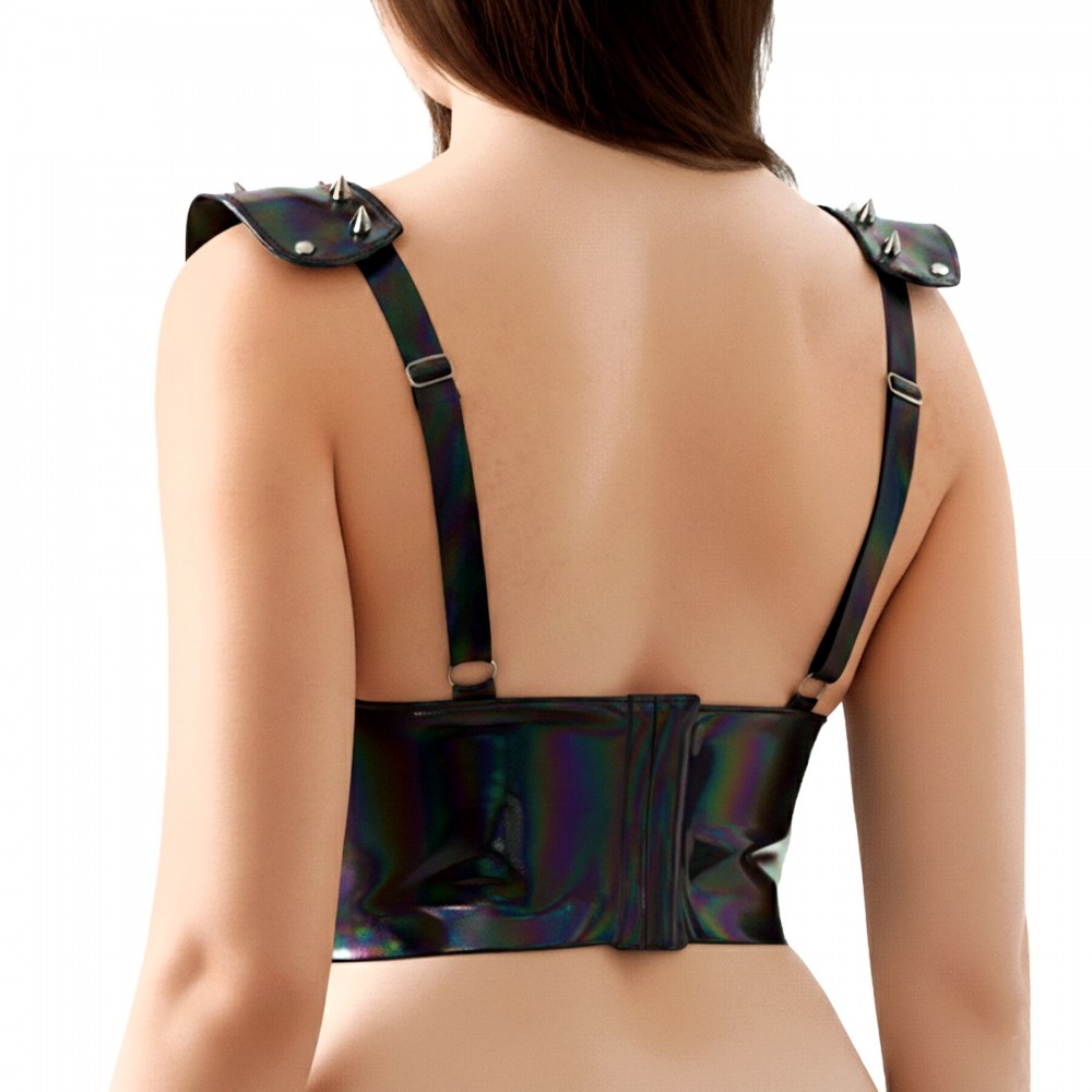 Топ прекрасно сочетается с юбками, брюками, кожаными изделиями, а также может стать частью сценического, клубного или фетиш-образа. Подходит для фотосессий, тематических мероприятий и вечерних выходов.