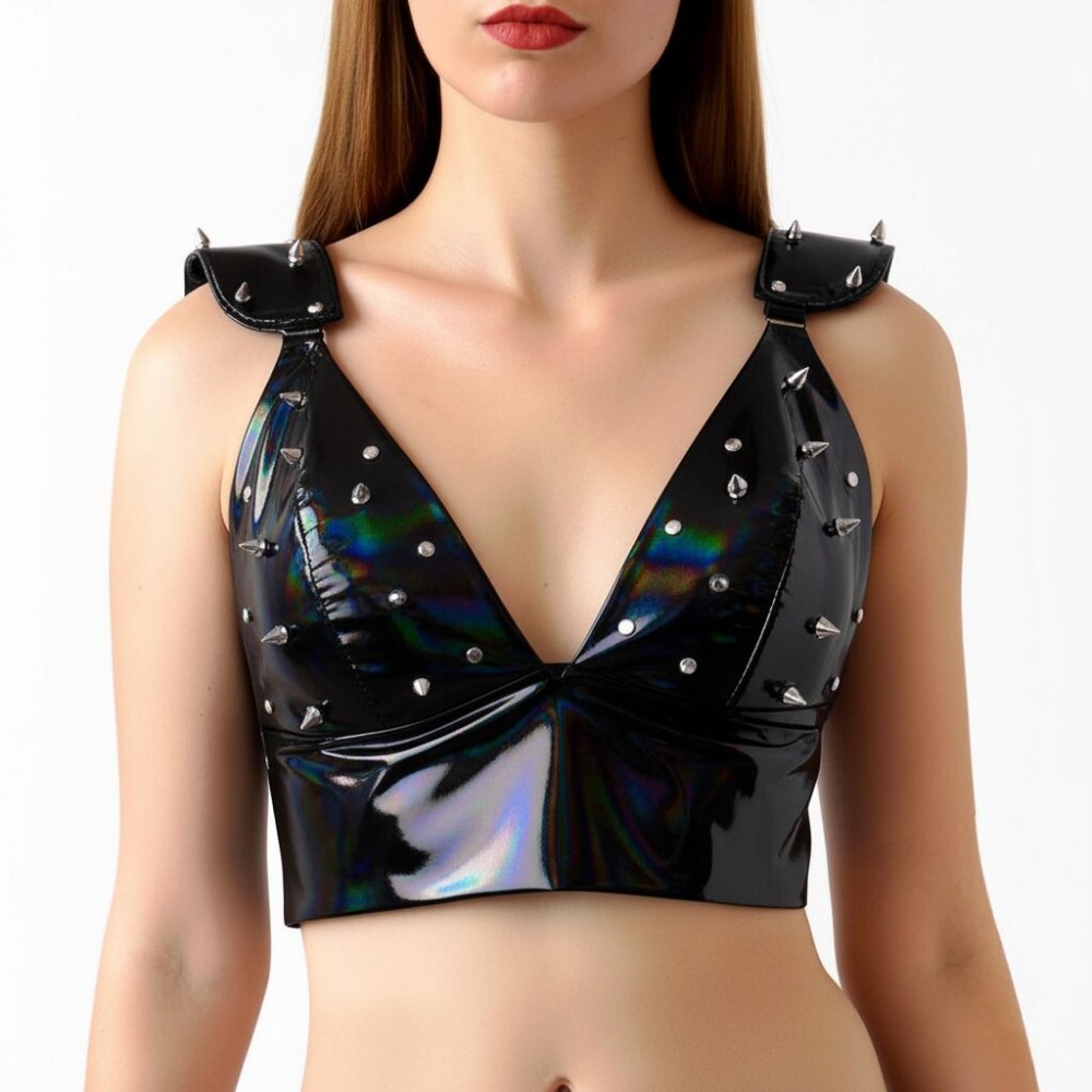 Эффектный виниловый топ Mistress создан для смелых образов и уверенного самовыражения. Глубокий V-образный вырез подчеркивает линию декольте, а плотная посадка формирует выразительный силуэт. Декоративные металлические шипы на чашках и плечах придают модели характер и делают ее акцентной деталью образа.