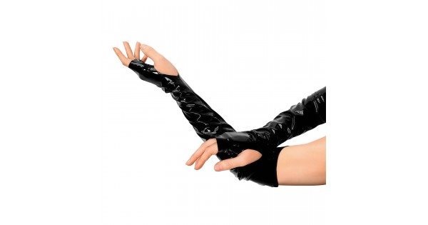 Эти виниловые митенки — чистый характер. Длинные, глянцевые, с открытыми пальцами — они вытягивают силуэт рук и добавляют образу хищной уверенности. Плотный винил красиво облегает кожу, создавая эффект второй кожи с зеркальным блеском.