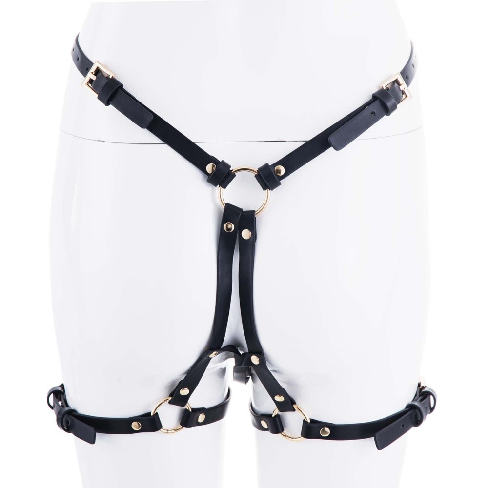 Модель выполнена из высококачественной выделанной кожи черного цвета. К треугольной передней панели заклепками прикреплено металлическое кольцо для фиксации фаллоимитатора. На теле этот «треугольник наслаждения» держится при помощи ремней, обвитых вокруг талии. На пояснице они соединены металлическим кольцом, от которого отходят крепления для ног. Подогнать ремни по фигуре можно сразу в нескольких местах: на поясе, на ногах, а также в области лобка. Чтобы скорректировать посадку, достаточно затянуть или ослабить пряжки.
