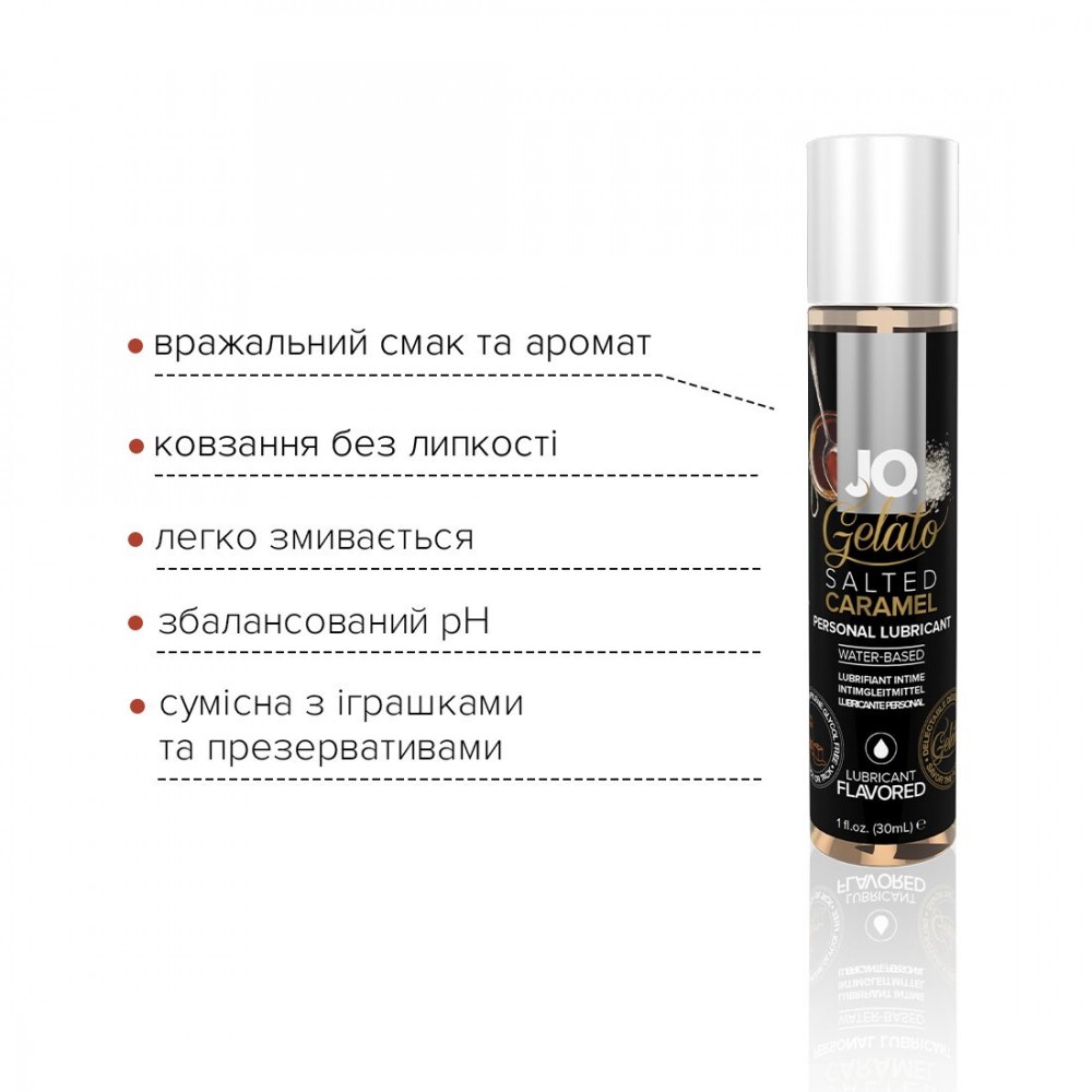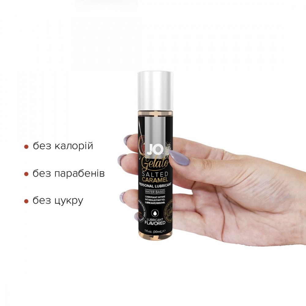 Лубрикант на водній основі JO GELATO SALTED CARAMEL, солона карамель (30 мл) з колекції інтимних смакових лубрикантів, створених спеціально для яскравої прелюдії та комфортної близькості. Виготовлені з використанням гліцерину на рослинній основі та інших високоякісних інгредієнтів, засоби цієї колекції забезпечують приємне та тривале ковзання. У формулі цих смакових лубрикантів немає цукру, парабенів та пропіленгліколю — для м’якшого ковзання. Без липкості та післясмаку.